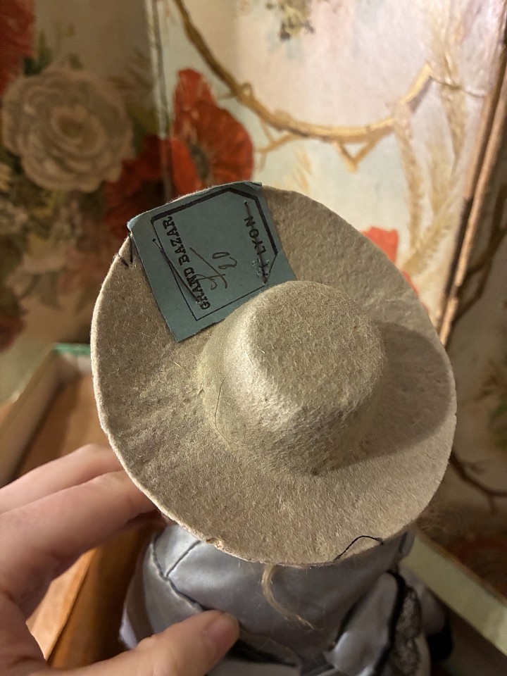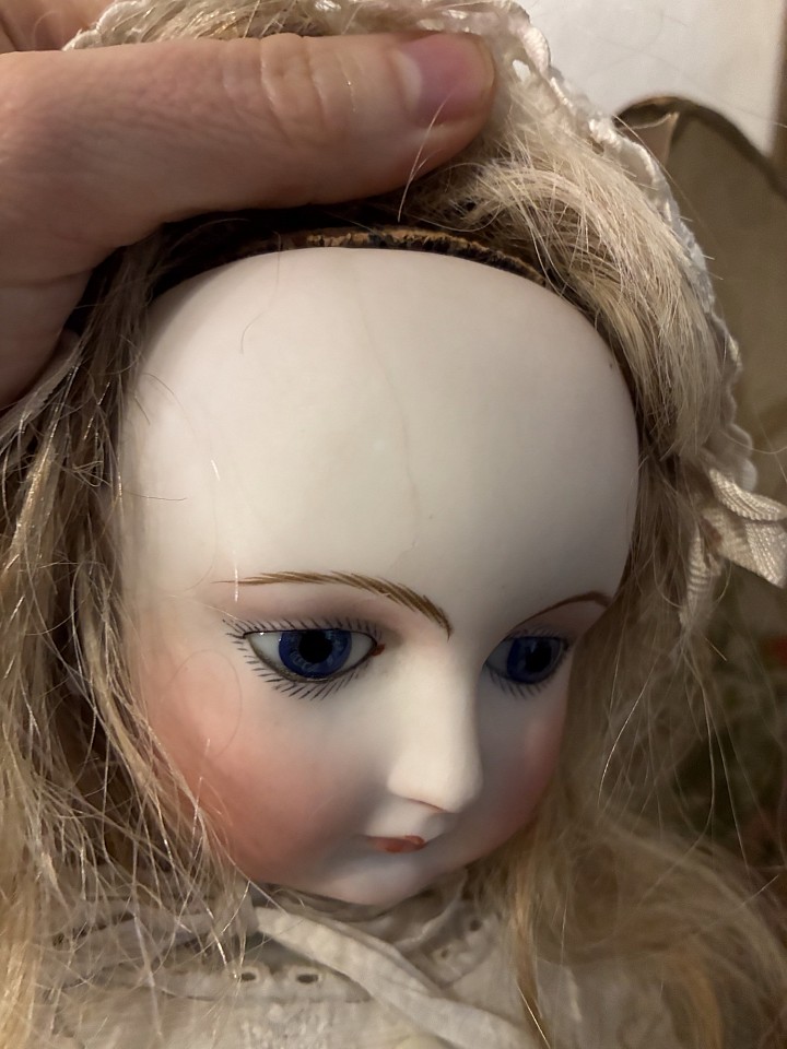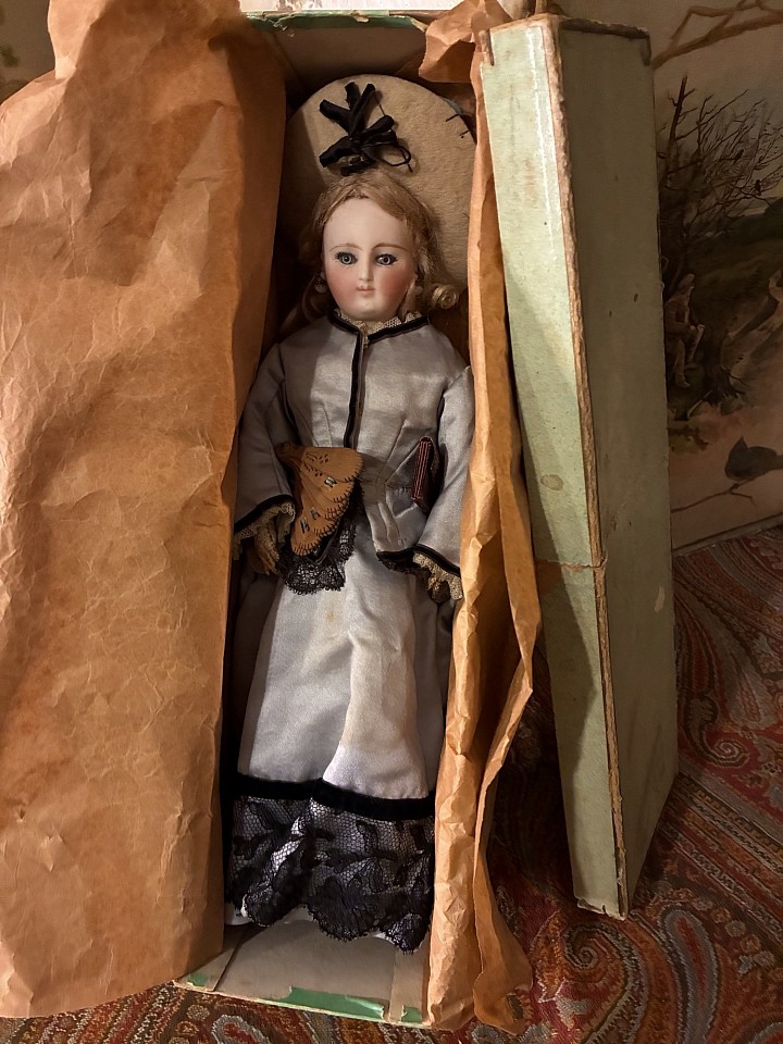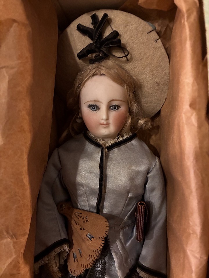 Porcelain shoulder head,cobalt blue glass enamel eyes,dark eyeliner,painted lashes,feathered brows,accented nostrils,closed mouth with center accent line, blonde mohair wig,kid poupee body. Comments: attributed propably to Deluac circa 1875. Value Points: beautiful lady doll in a rare small size with fine luminous porcelain,fine antique costume. Original earrings and wonderful mint condition dress, she was preserved in this box, there is an original Lyon label on her hat, the doll comes also with a tiny little fan and purse
