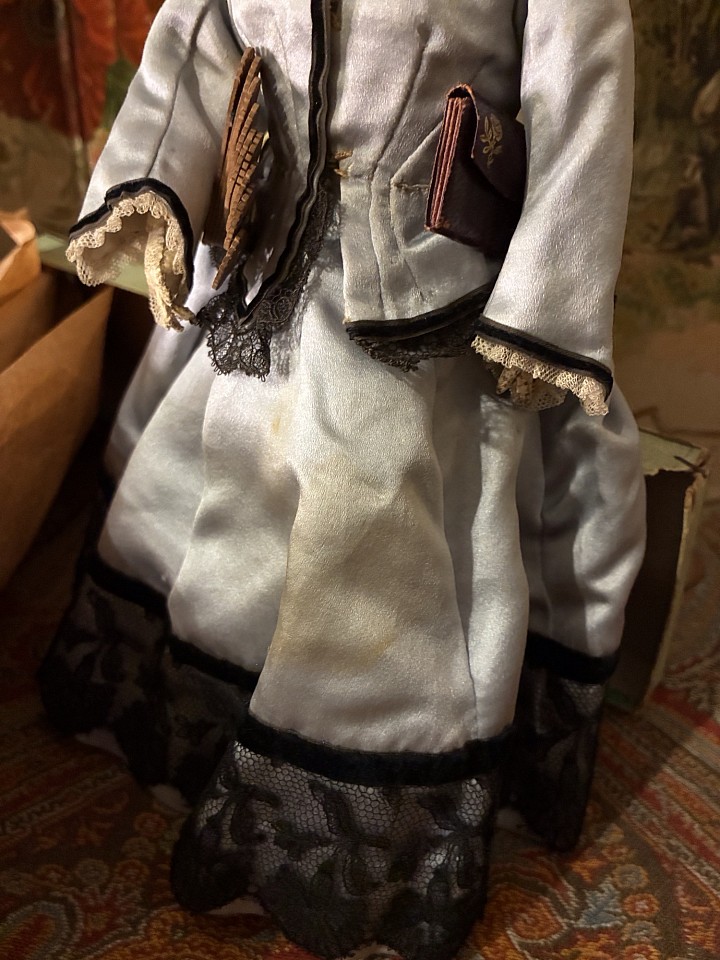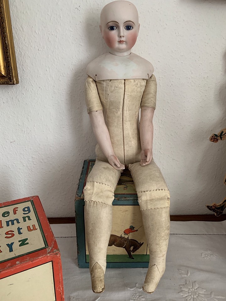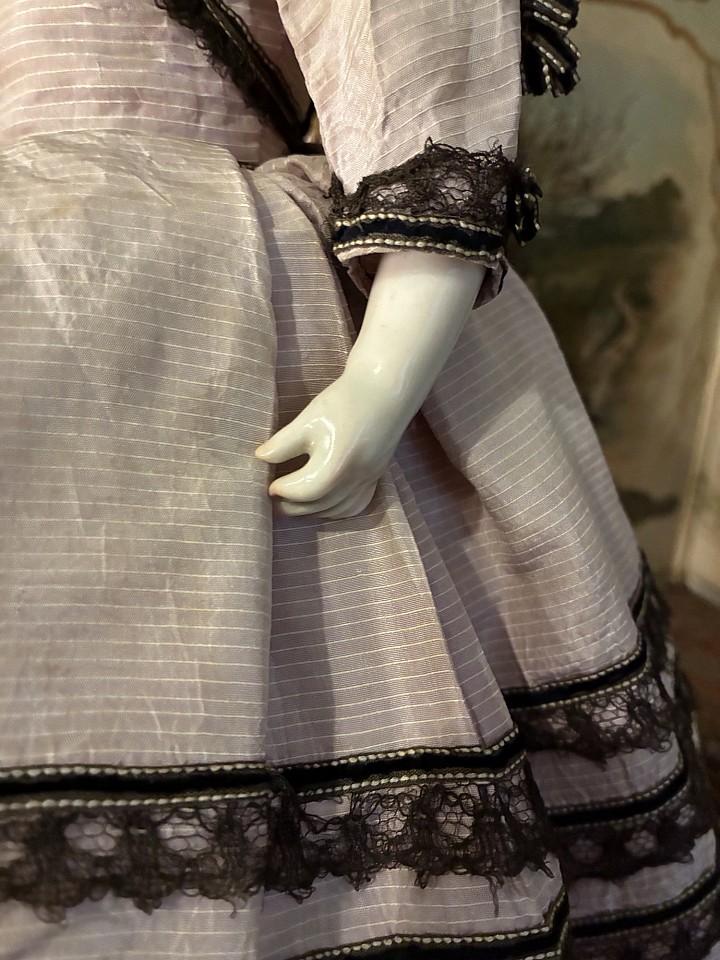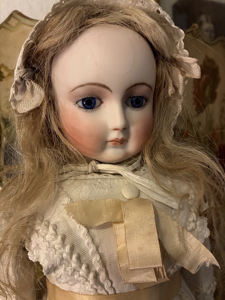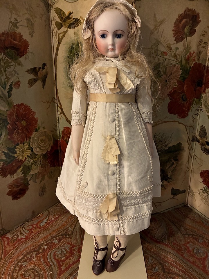 Beautiful big fashion lady by Simon and Halbig, fine bisque swivel head on shoulder plate, on kid leather body with bisque arms, blue glass eyes, fine facial painting, she is wearing an old mohair wig. The doll is dressed with a beautiful and original pique cotton dress. Germany 1870.