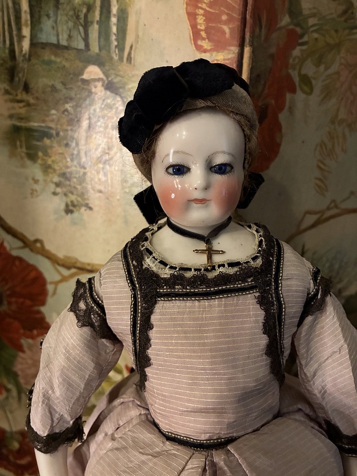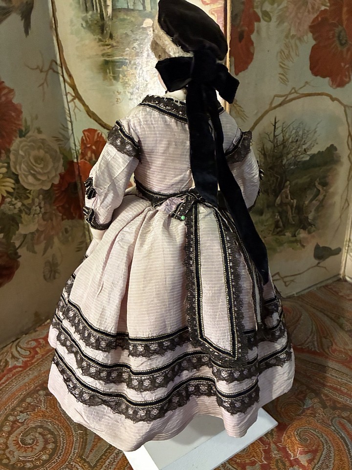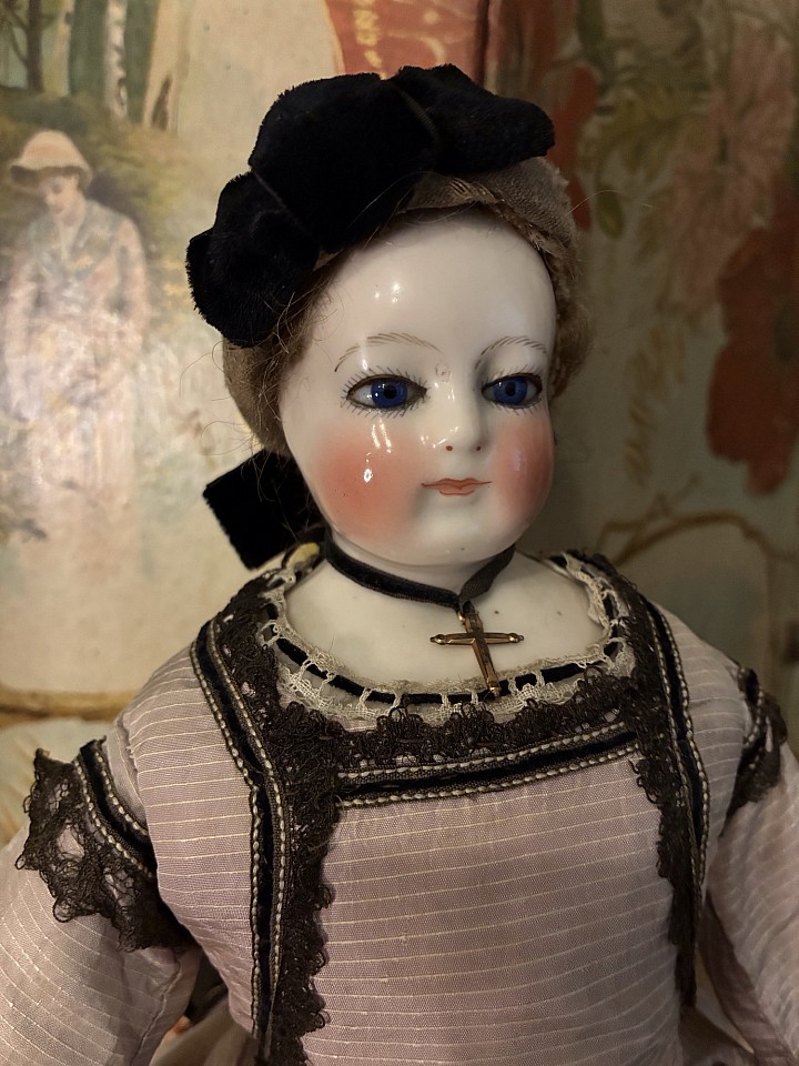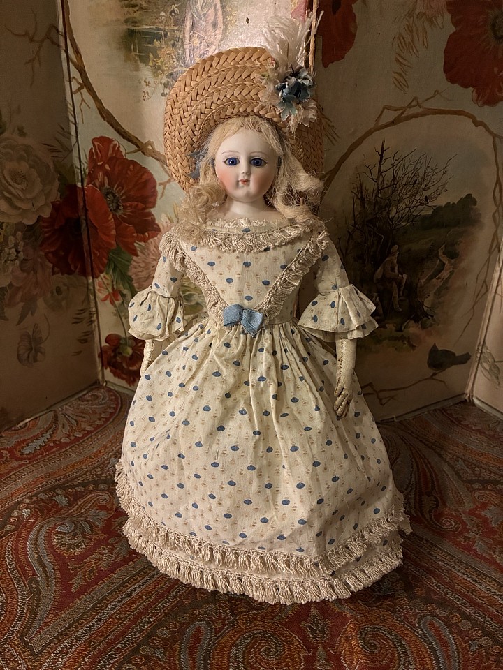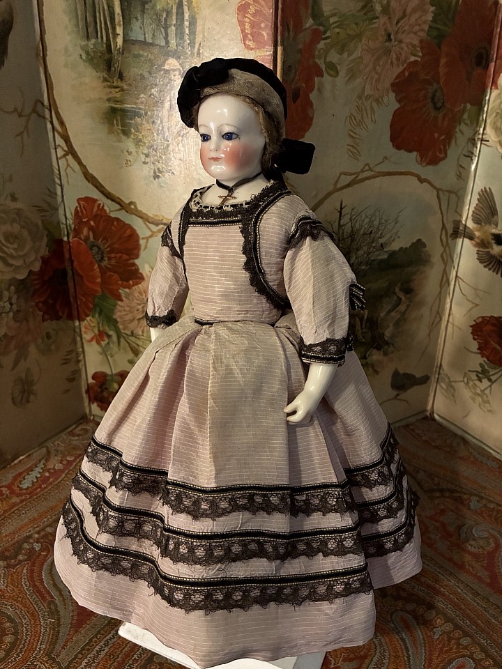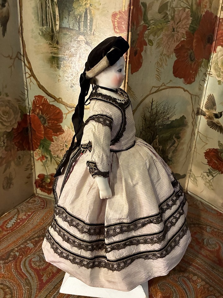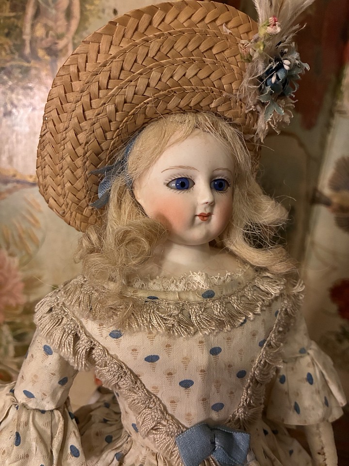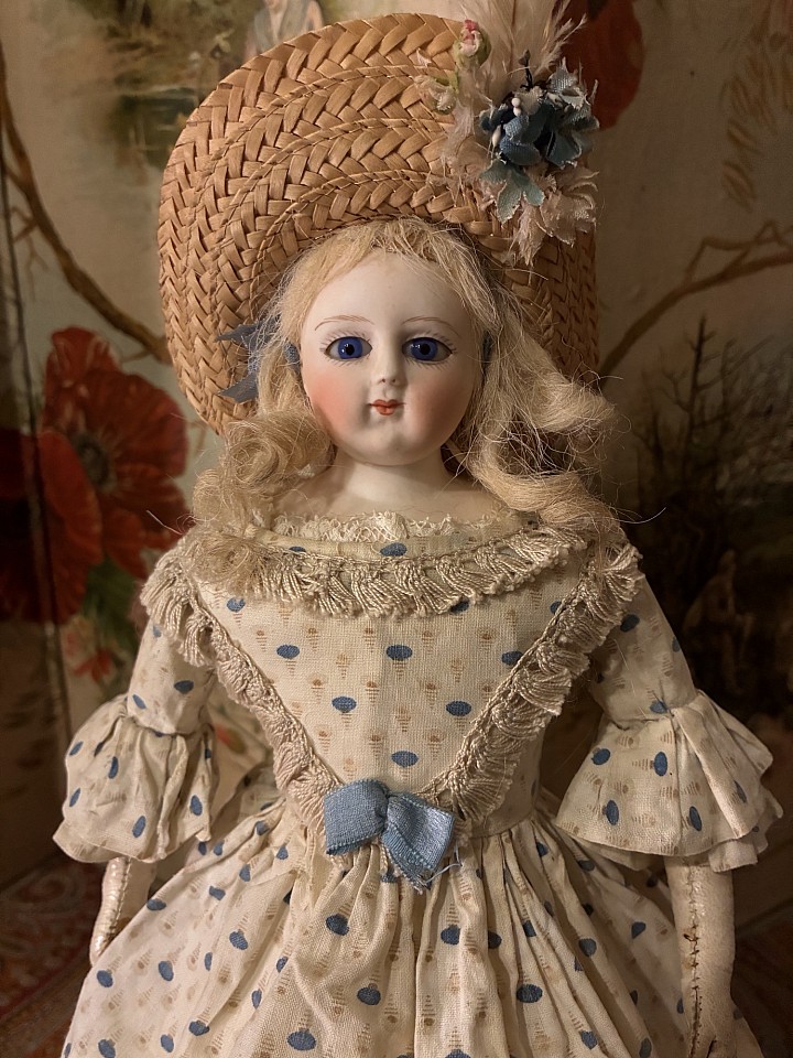 Porcelain swivel head with flat-cut neck socket on matching porcelain shoulder plate, slightly pink tinted complexion, painted rich blue upper glancing eyes, painted all-around lashes, black upper eyeliner, lightly feathered brows, accented nostrils and eye corners, closed mouth, accent line between the lips,blonde mohair wig over cork pate with original Rohmer stringing- pin in pate, softly-stuffed Rohmer body with original sitting pull-strings in torso, wooden ball-jointing at knees, porcelain arms to above the elbows. Leontine Rohmer, circa 1858. Value Points: gorgeous poupee with pert smile is enhanced by very rare to find Rohmer deposed body features, and wears beautiful antique costume of the era.