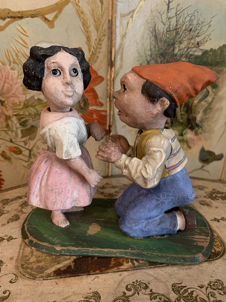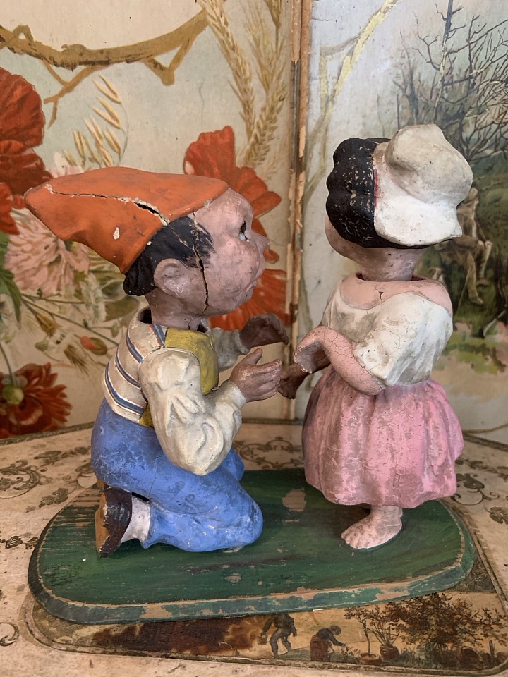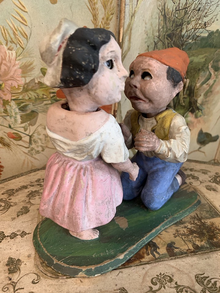 German paper mache nodding figures scene of couple, both with flirty glass eyes, on wooden base. German ca 1860/1870.