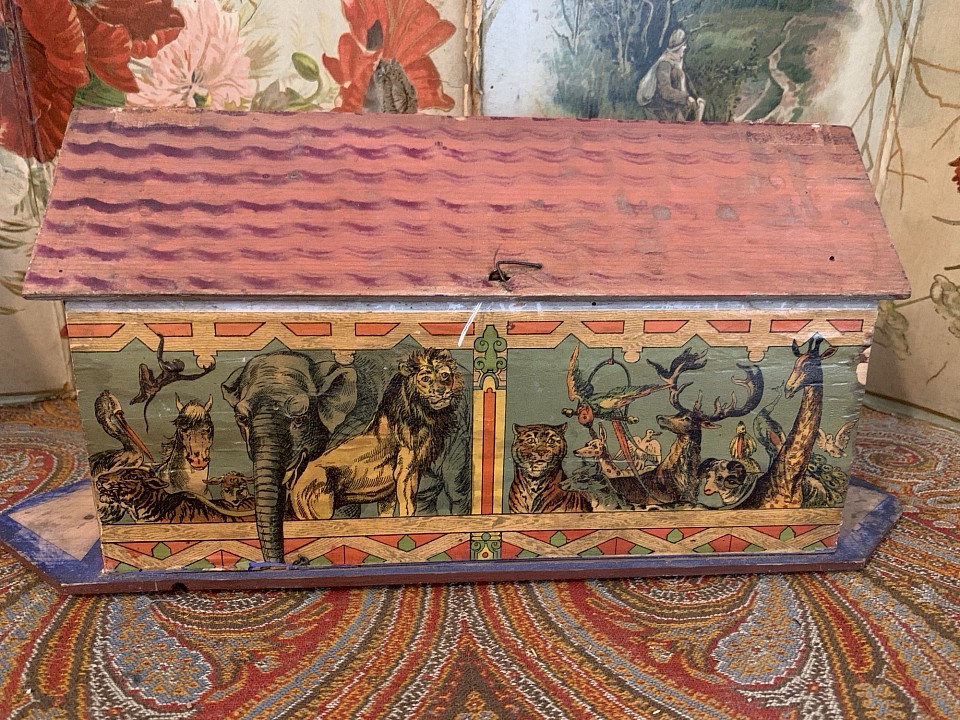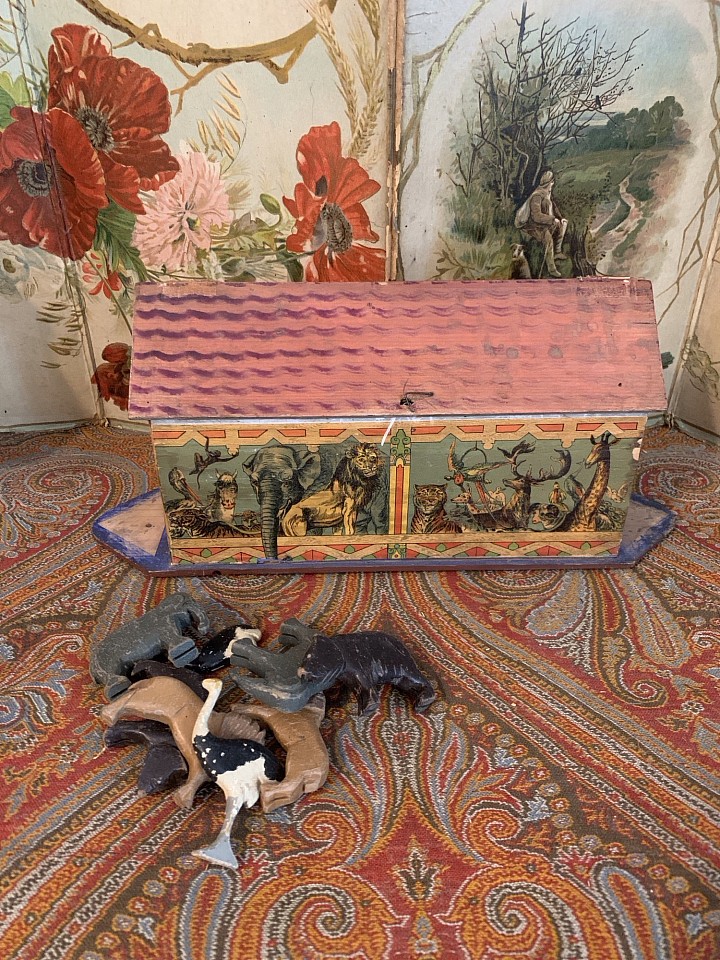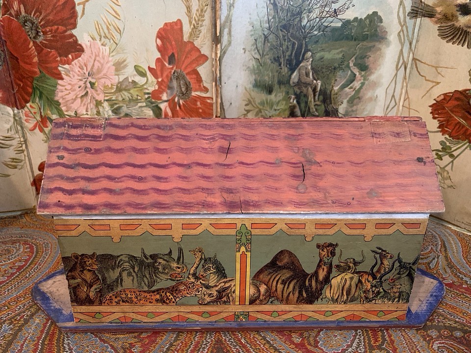 Interesting wooden ark with lithographed design. Germany 1880/1890. Included are some wooden animals